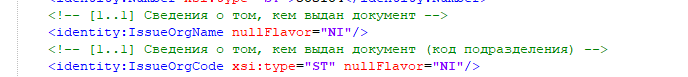 | Ошибка = 'Ошибка валидации Schematron: У1-20. Элемент ClinicalDocument/recordTarget/patientRole/identity:IdentityDoc/identity:IssueOrgName должен иметь значение атрибута @xsi:type равное 'ST'. Путь: /ClinicalDocument[1]/recordTarget[1]/patientRole[1]/identity:IdentityDoc/identity:IssueOrgName/@xsi:type='ST'', Код = 'VALIDATION_ERROR' | На дату создания СЭМД не заполнен реквизит в ДУЛ Кем выдан. |