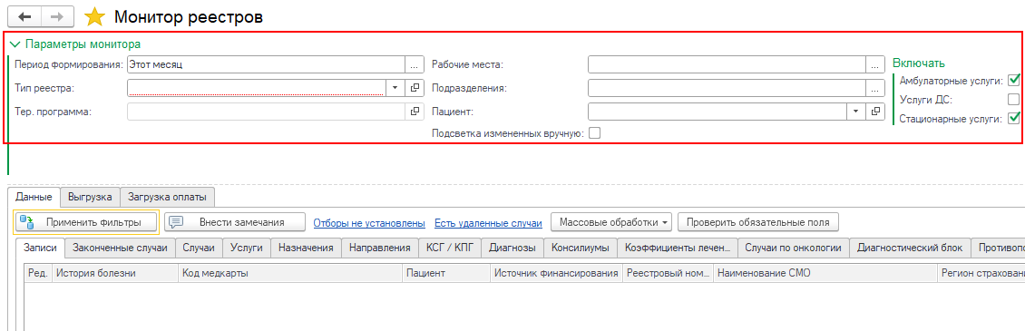 Для Открыть «Монитор реестров». Заполнить параметры отбора для отображения данных для реестра в табличной части, необходимо заполнить поля: