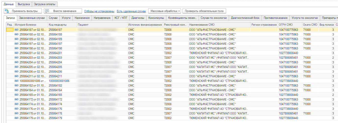 В табличной части расположен набор вкладок. Название вкладок и название колонок во вкладках соответствуют наименованиям элементов данных реестра согласно информационному взаимодействию