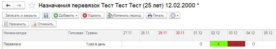 По команде «Добавить» – добавляется строка в табличную часть. Команда «Назначить период» - отражает видимость колонок с датами на форме. Для удаления перевязки из списка используется команда «Удалить».