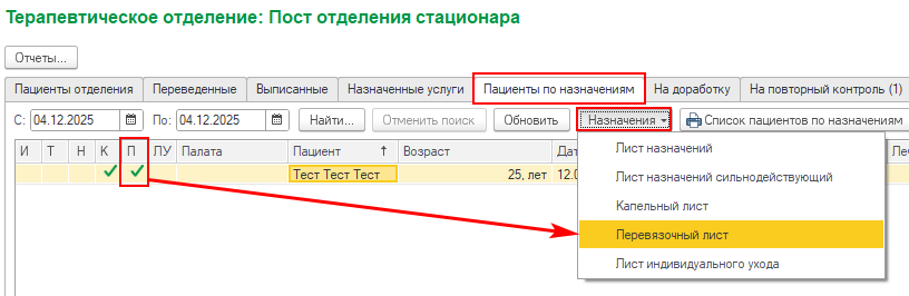 После назначения перевязки врачом ответственный сотрудник (обычно медицинская сестра) по аналогии с лекарственными назначениями через вкладку «Пациенты по назначениям»«Назначения»«Перевязочный лист» ставит отметку об выполнении или отменяет перевязку