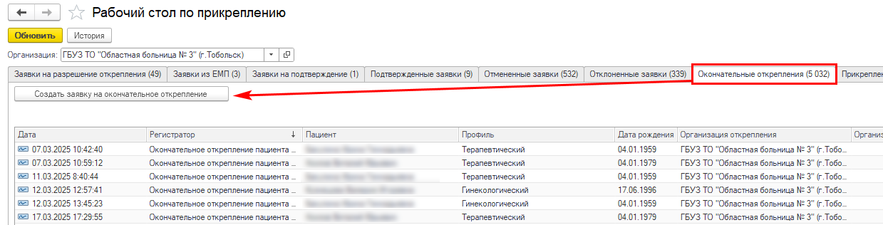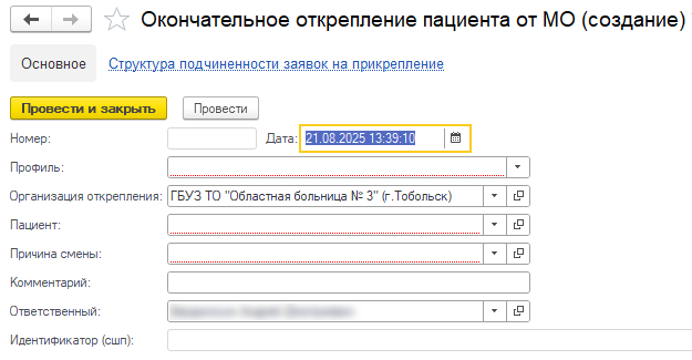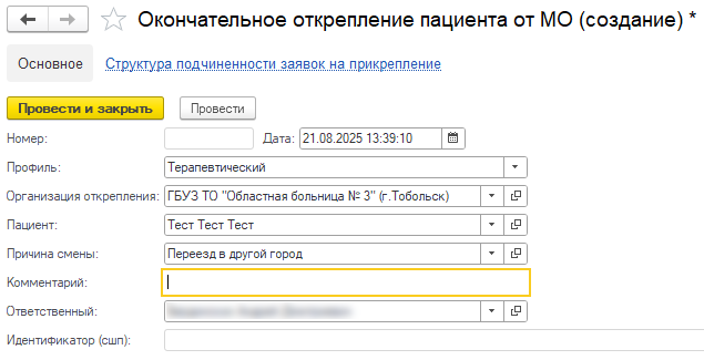 Внимание! Окончательное открепление создается в случае переезда пациента в другой регион или по причине смерти (автоматически после регистрации смерти)