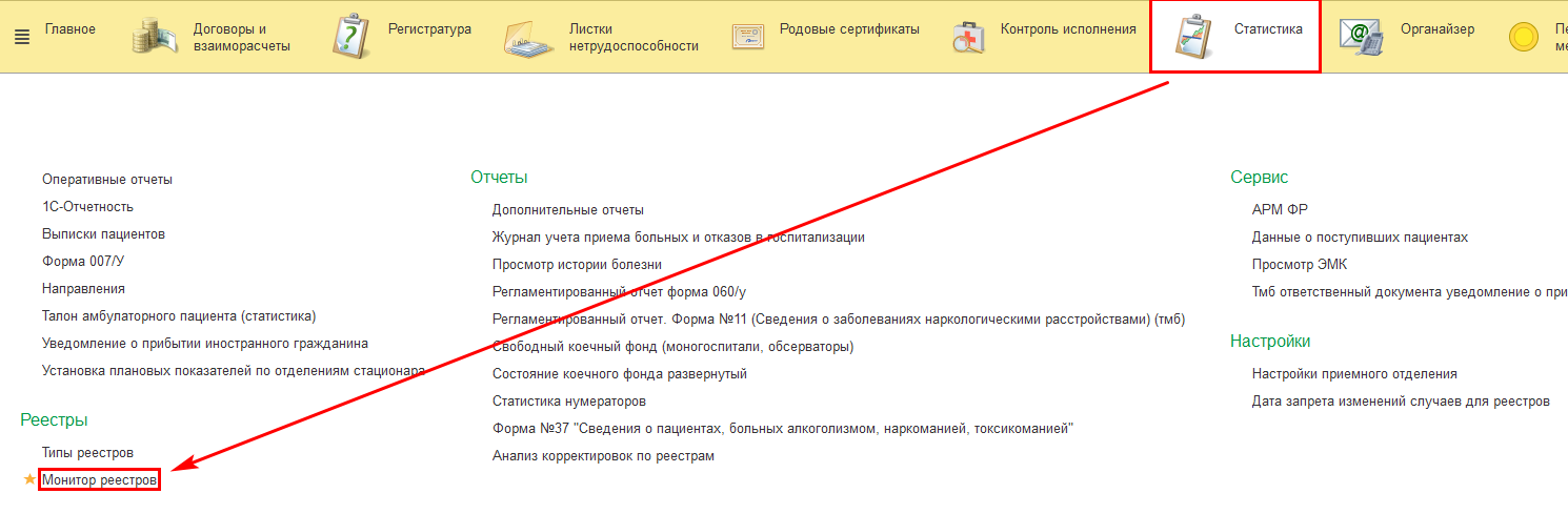 Формирование реестров оказанных медицинских услуг для ТФОМС реализуется в разделе "Монитор реестров" «Монитор реестров» – «Реестры» подсистемы «Статистика». Ниже приведены подробные инструкции по работе с функционалом данного раздела.