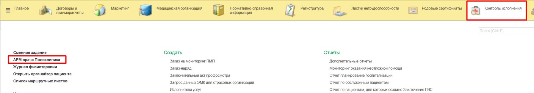 Для того, чтобы подготовить пакет документов для направления на ВМП, необходимо перейти в подсистему «Контроль исполнения», далее «АРМ врача Поликлиника». В списке необходимо двойным щелчком выбрать пациента. В случае отсутствия пациента в списке необходимо записать его на прием через команду «Поиск пациента».