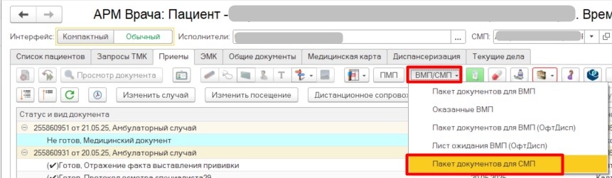 Открылась форма «Арм врача». В перечне записанных пациентов найти нужного, двойным щелчком по пациенту перейти во вкладку «Приемы», выбрать случай и добавить посещение (либо открыть новый случай). Нажать кнопку «ВМП/СМП» и выбрать «Пакет документов для СМП».