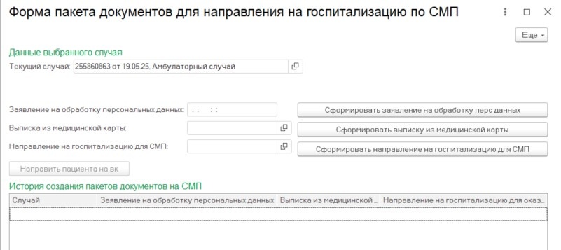 Таким образом открылась «Форма пакета документов для направления на госпитализацию по СМП».
