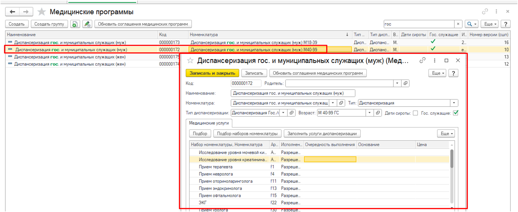 Рис. 8 Медицинская программа «Диспансеризация гос. и муниципальных служащих (муж) М40-99»