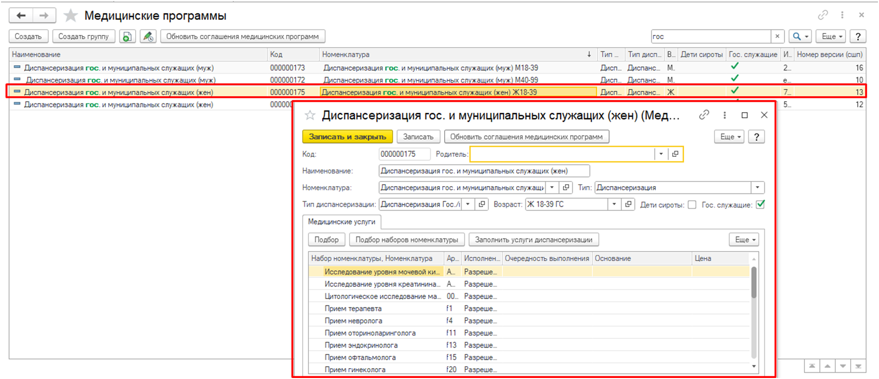Рис. 7 Медицинская программа «Диспансеризация гос. и муниципальных служащих (муж) М18-39»