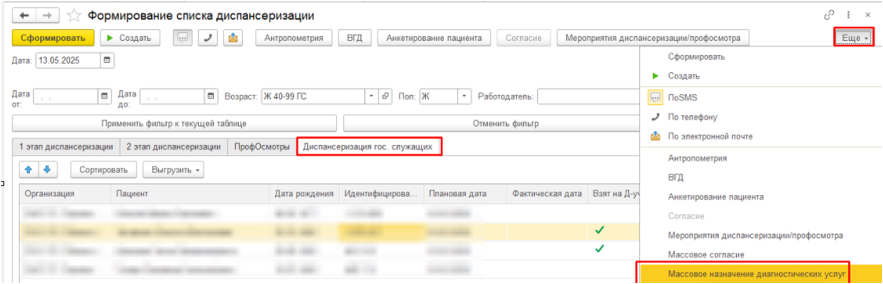 Назначение услуг осуществляется стандартным способом, ранее реализованным в обработке «Формирование списка диспансеризации», т.е. необходимо перейти на нужную вкладку, в данном случае это вкладка «диспансеризация гос. служащих», с помощью кнопки «Еще» раскрываем перечень функций, выбираем «Массовое назначение диагностических услуг» (рис. №11).