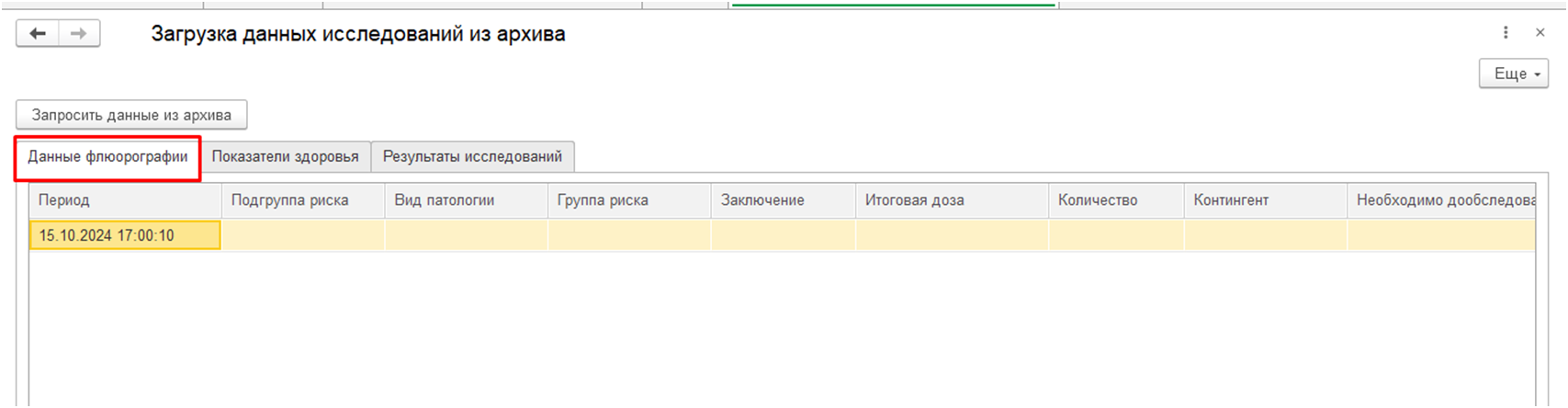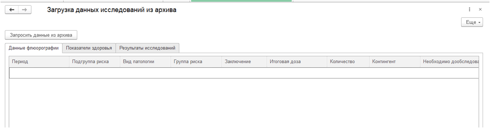 При нажатии на кнопку «Просмотр данных архива» открывается форма «Загрузка данных исследований из архива». На форме «Загрузка данных исследований из архива» запрос данных из из других МО осуществляется посредством кнопки «Запросить данные из архива», таким образом, имеющиеся у пациента подгружаются на три отдельные вкладки, в зависимости от типа данных: «Данные флюорографии», «Показатели здоровья», «Результаты исследований» (рис. №15, №16, №17, №18).
