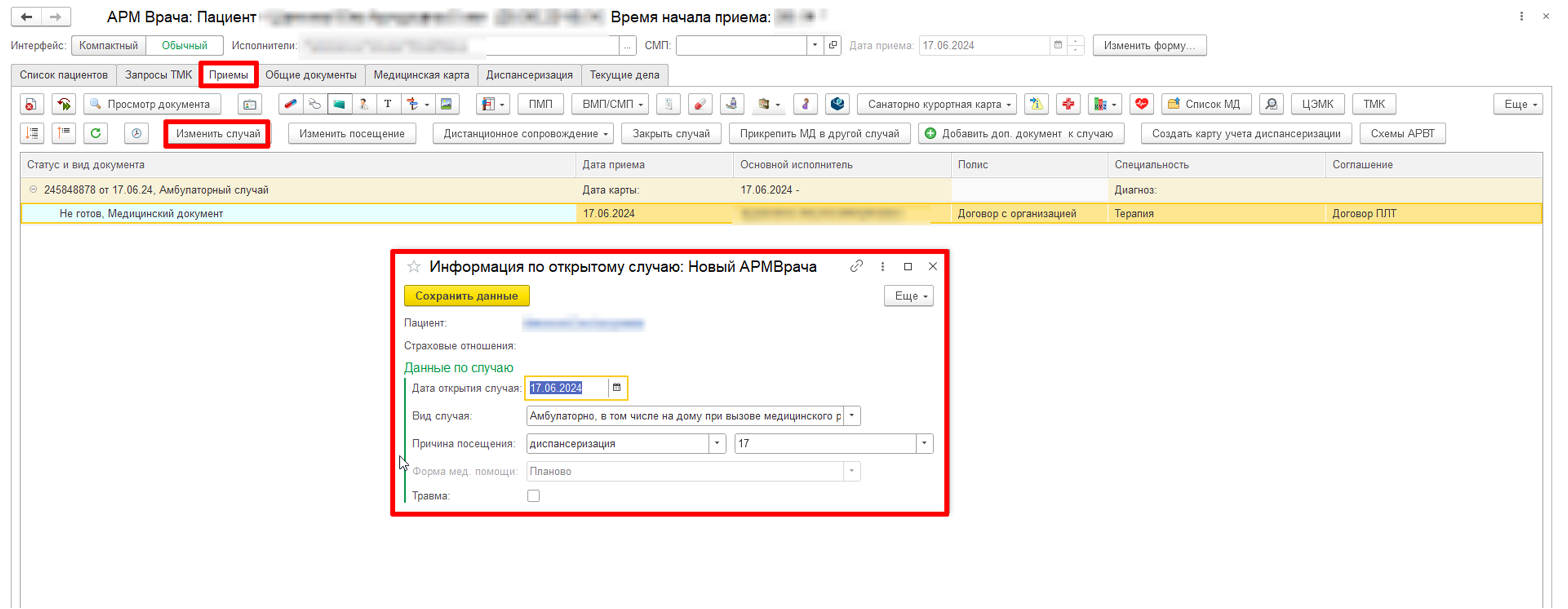 Таким образом, открывается форма АРМ врача – Список пациентов, переходим на вкладку «Приемы», на вкладке приемы стандартным способом оформляется прием пациенту, открывается случай и далее выбираем ШМД «Заключение терапевта по итогам диспансеризации/профосмотров» (рис. №22, рис. №23).