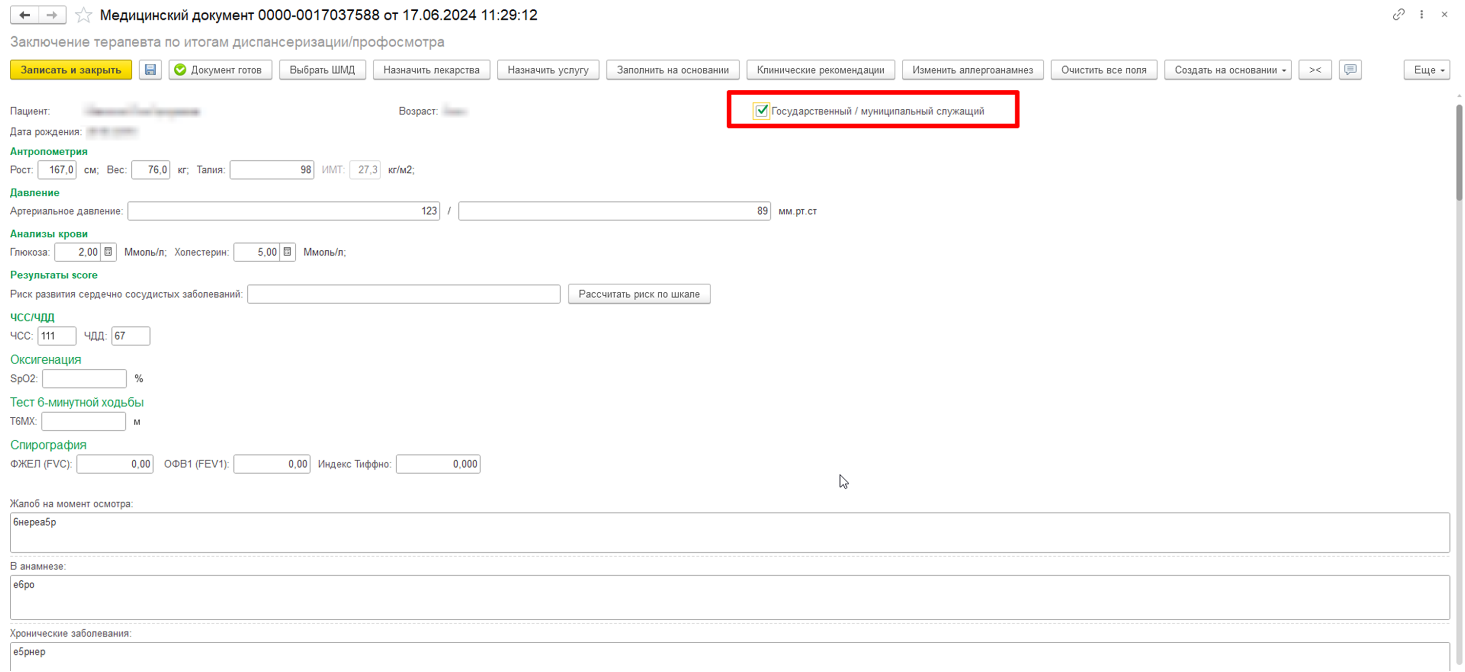 - При установлении галочки в чек-боксе «Государственный/муниципальный служащий» в «шапке» наименования появляется приписка о том, что это ШМД «Заключение терапевта по итогам диспансеризации/профосмотров Государственного/муниципального служащего» (рис. №27).