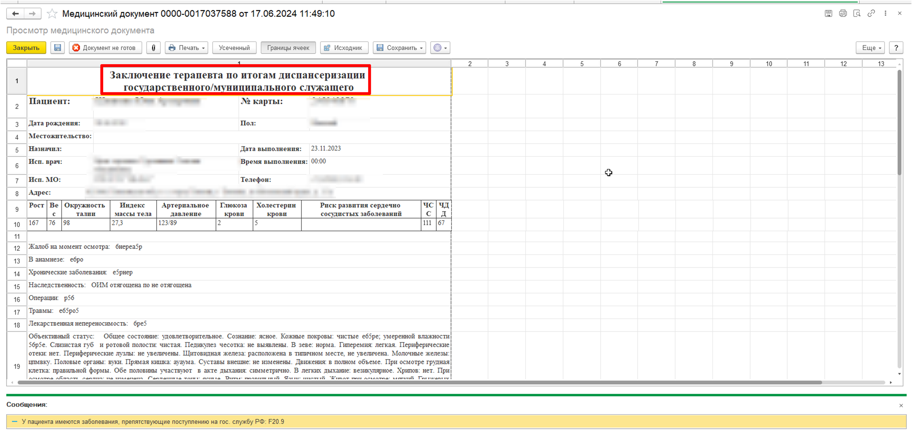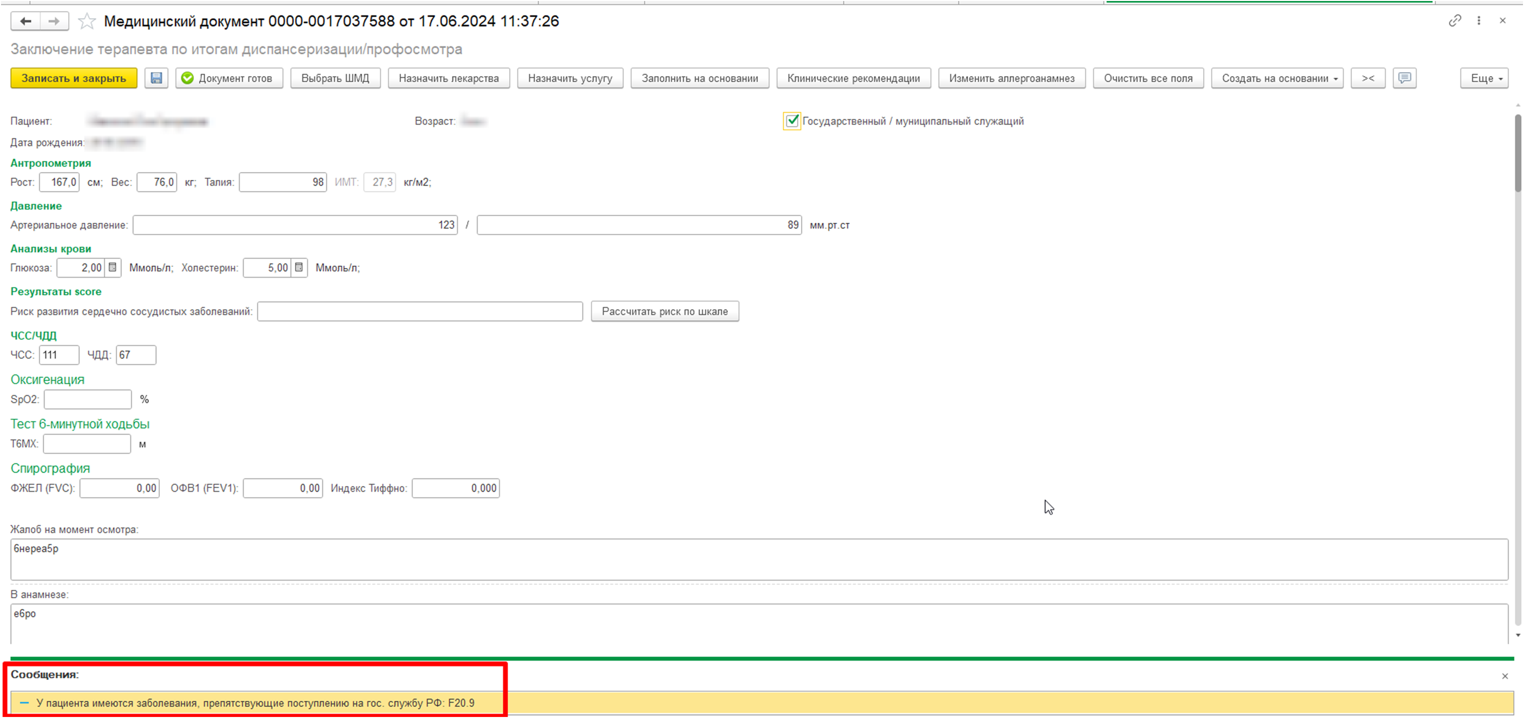 На форме ШМД «Заключение терапевта по итогам диспансеризации/проф.осмотров» выводится уведомление пользователю о том, что у пациента имеется заболевание, препятствующее прохождению гос./муниципальной службы (рис. №34).