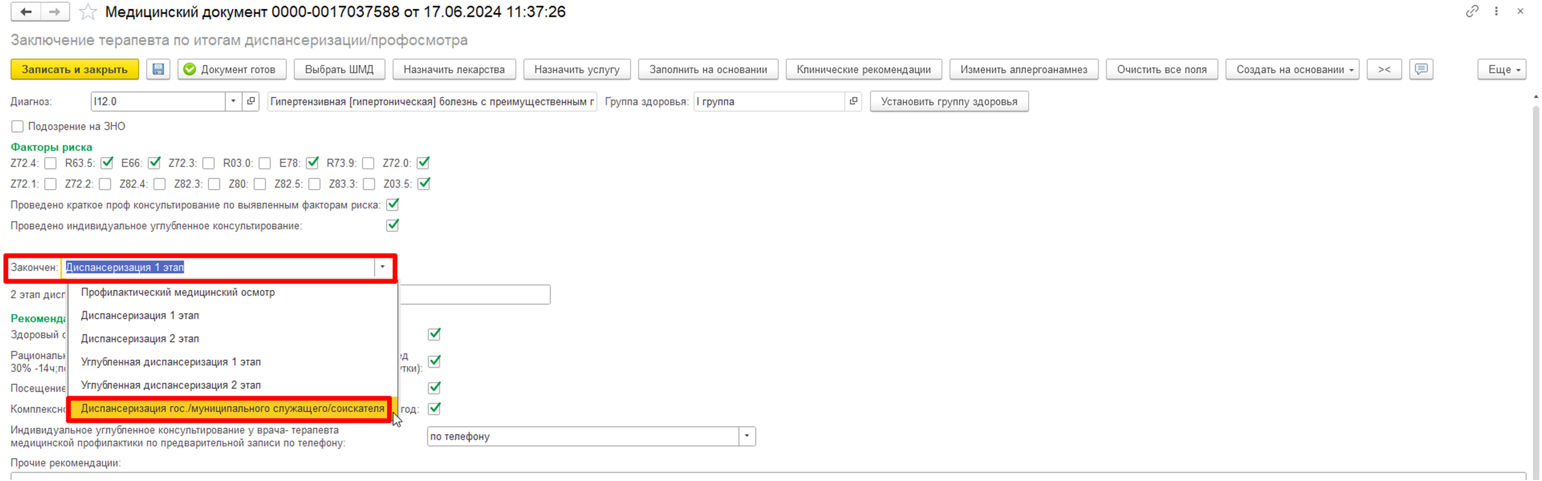 ШМД «Заключение терапевта по итогам диспансеризации/профосмотров» доработан следующим образом: