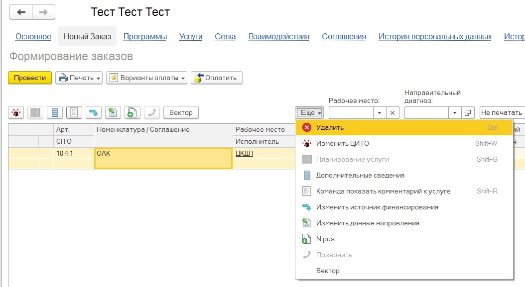 - Изменить CITO — устанавливает текущей услуге статус CITO;
