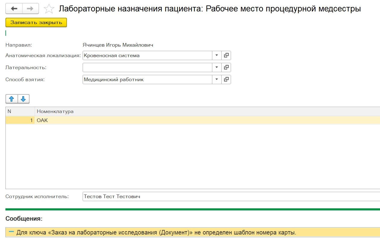 В Рабочем месте процедурной сестры при формировании назначения на лабораторные исследования при проведении документа появляется сообщение вида "Для ключа «Заказ на лабораторные исследования (Документ)» не определен шаблон номера карты"