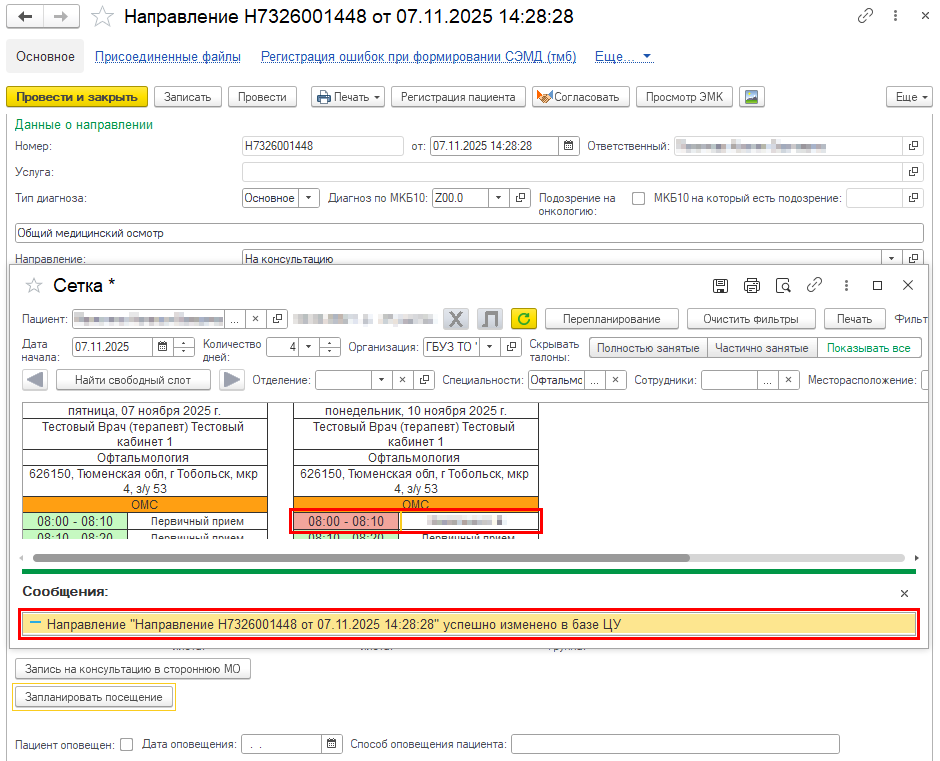 На форме "Сетка" выбрать подходящий слот и записать пациента на прием. После записи выведется сообщение с информацией о том, что направление с № успешно создано (при условии, что ранее направление в базе не было) в базе ЦУ (базе центрального узла):