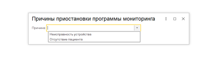 При нажатии "Приостановить" в ниспадающем меню "Персональные медицинские помощники" пользователю выводится окно выбора причины приостановки программы: