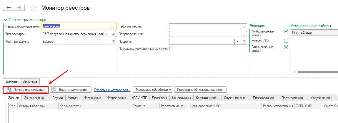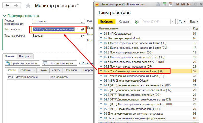 В форме «Монитор реестров» в поле «Тип реестра» выбрать значение «05.7 Углубленная диспансеризация I этап (DA)».