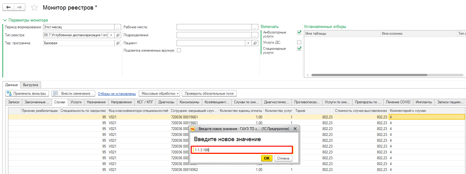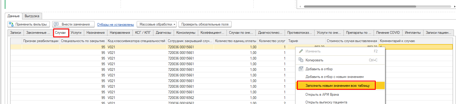Перейти на вкладку «Случаи» и в колонку «Комментарий к случаю» помимо кода особого случая «4» добавить через запятую, коды услуг 1.1.3.186 или 1.1.3.186, 1.1.3.187. Для этого кликнуть правой кнопкой мыши по коду особого случая и в списке выбрать «Заполнить новым значением всю таблицу».