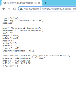 - Заходим на 10.2.145.17 и вставляем ссылку в браузер http://haproxy.miac.lan:82/hospital_okb2/hs/venul/referenceInformation/patients?patientID=3856186 (вместо hospital_okb2 можно писать любую базу. а пациент нам в данном случае не важен мы проверяем что сервис отвечает, а не правильность данных)