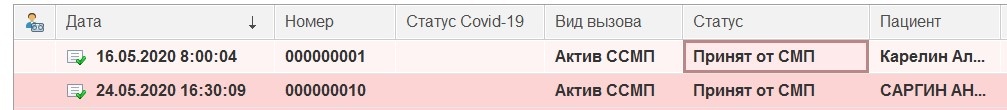 Системой предусмотрено принятие вызовов от ССМП. Если вызов пришел от скорой помощи, то на главной форме в столбце «Источник записи» установлено значение «ССМП».