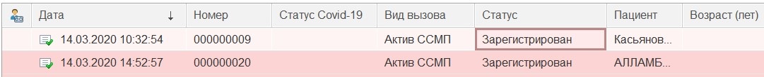 Как только регистратор откроет форму с вызовом, нажмет кнопку «Провести и закрыть», статус автоматически сменится на «Зарегистрирован». Это означает, что регистратор подтверждает принятие вызова от скорой. Все статусы вызовов передаются в ССМП.