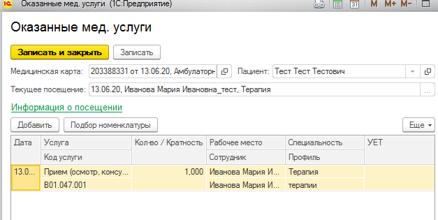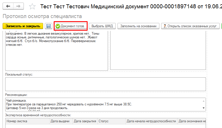 Форма «Оказанные мед. услуги» приобретет следующий вид. Для сохранения необходимо нажать кнопку «Записать и закрыть» и снова нажать кнопку «Документ готов».