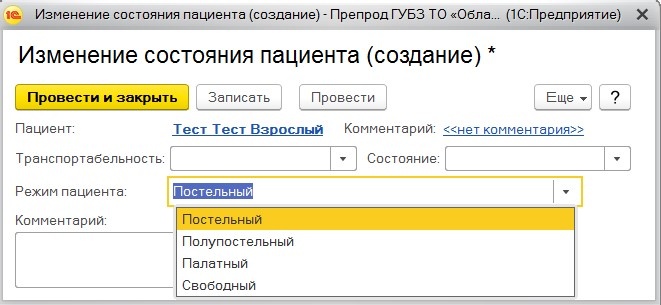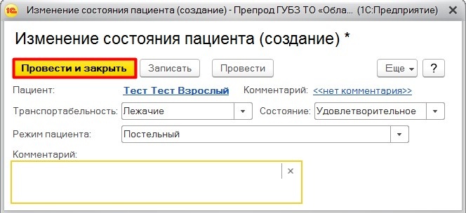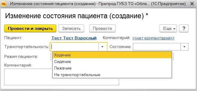 Изменение состояние пациента – документ предназначен для регистрации изменения состояния пациента. В документе заполняются реквизиты «Транспортабельность» и «Состояние».