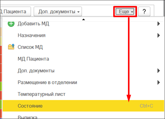 Для этого необходимо выбрать пациента в списке, на командной панели нажать кнопку «Еще» - «Состояние».