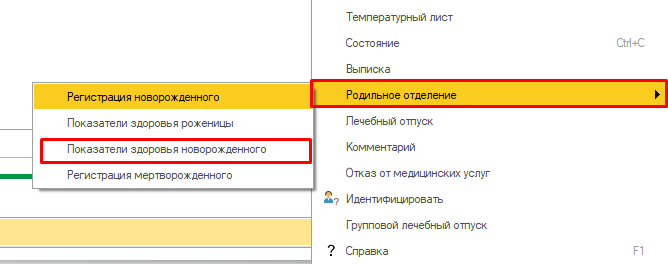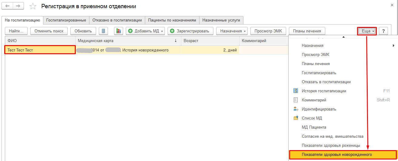 Документ «Показатели здоровья новорожденного» доступен в приемном отделении, на вкладке «На госпитализацию» и в отделениях круглосуточного стационара на вкладке «Пациенты отделения» (открытие форм описано в пунктах 1.1.1 Описание интерфейса Приемного отделения и 2.2.1 Описание интерфейса обработки «Пост отделения стационара») . Заполнение формы «Показатели здоровья новорожденного» аналогично в обеих подсистемах. На командной панели открыть меню «Еще», расположенное справа и выбрать команду «Показатели здоровья новорожденного» (в отделении стационара выбрать команду «Родильное отделение» - «Показатели здоровья новорожденного»).