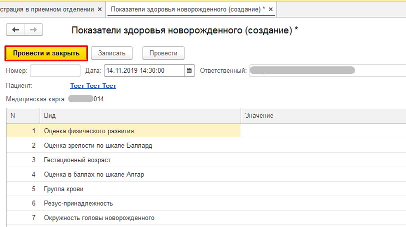 В открывшейся форме «Показатели здоровья новорожденного» заполнить необходимые данные в табличной части в поле «Значение». Далее выполнить команду «Провести и закрыть».