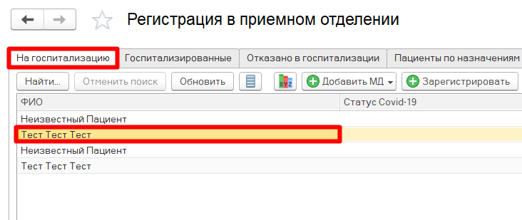 В списке пациентов на госпитализацию, выбрать нужного пациента и открыть документ "Поступление пациента в стационар" путем двойного нажатия по пациенту.